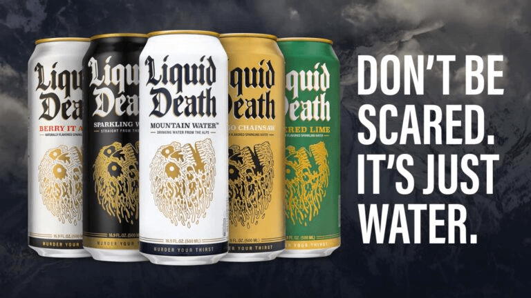 - Liquid Death เป็นแบรนด์น้ำแร่ค่ะ ที่แหวกแนวโดยการใช้ Package เป็นกระป๋องอลูมิเนียม เลียนแบบ “เบียร์” และฟ้อนท์เอย หรือ Marketing ที่ใช้เพลง metal หรือห่ามๆ ใดๆ ทำให้จับจิตจับใจเด็กรุ่นใหม่ หรือเป็นเครื่องดื่มที่ถือชนในงานปาร์ตี้สำหรับที่ไม่ดื่มแอลกอฮอล์ได้อย่างไม่เคอะเขิน